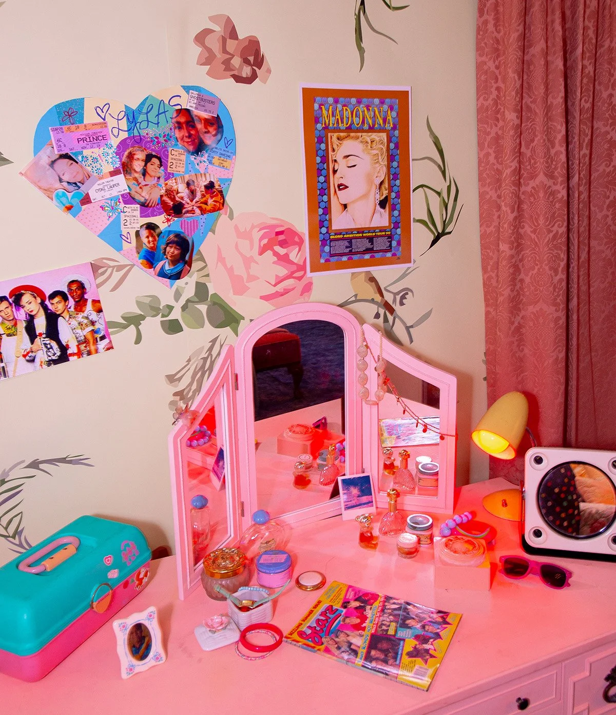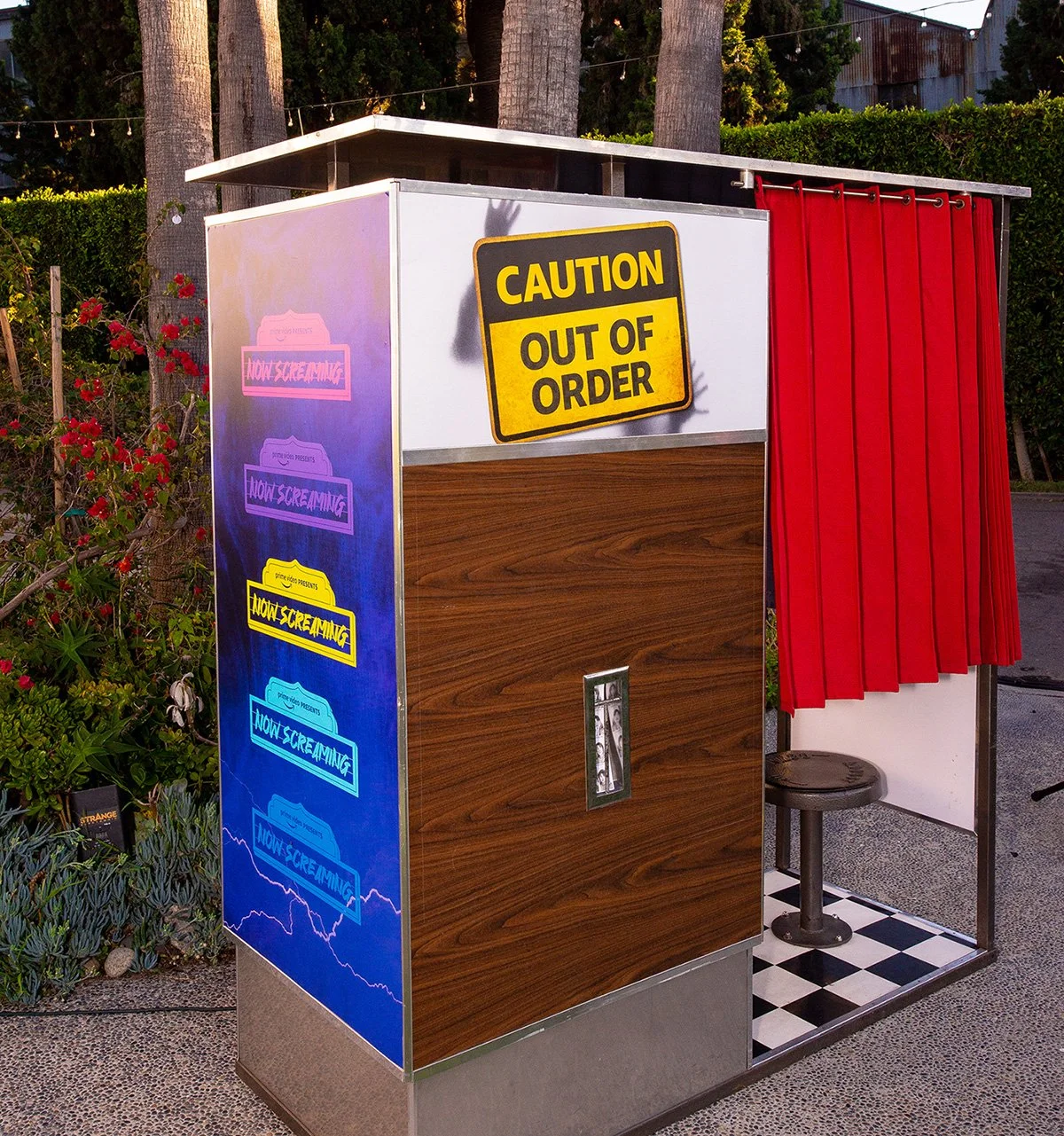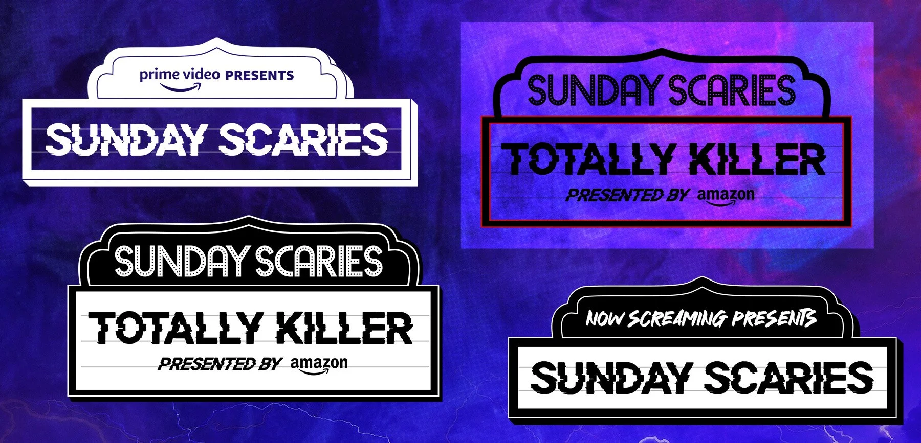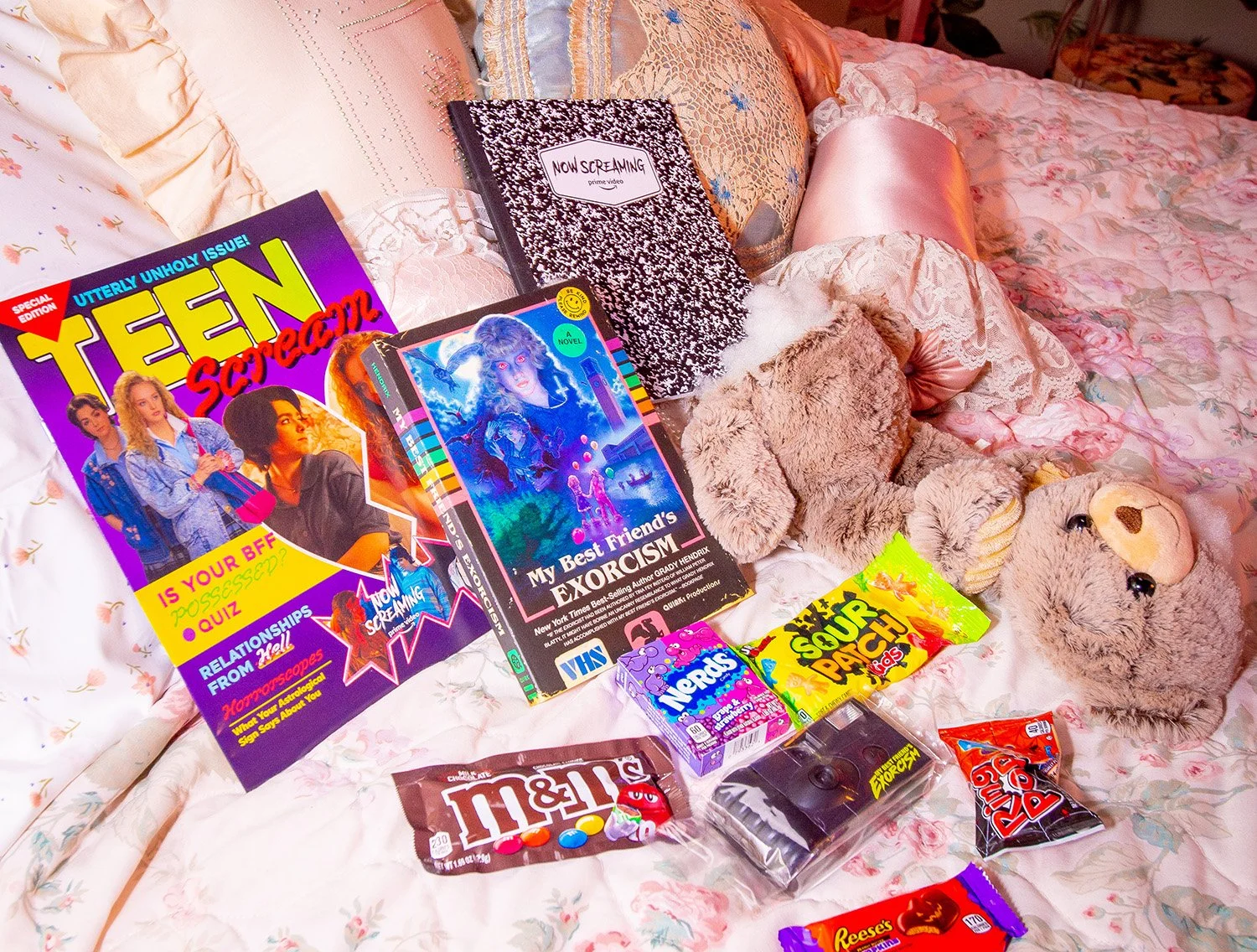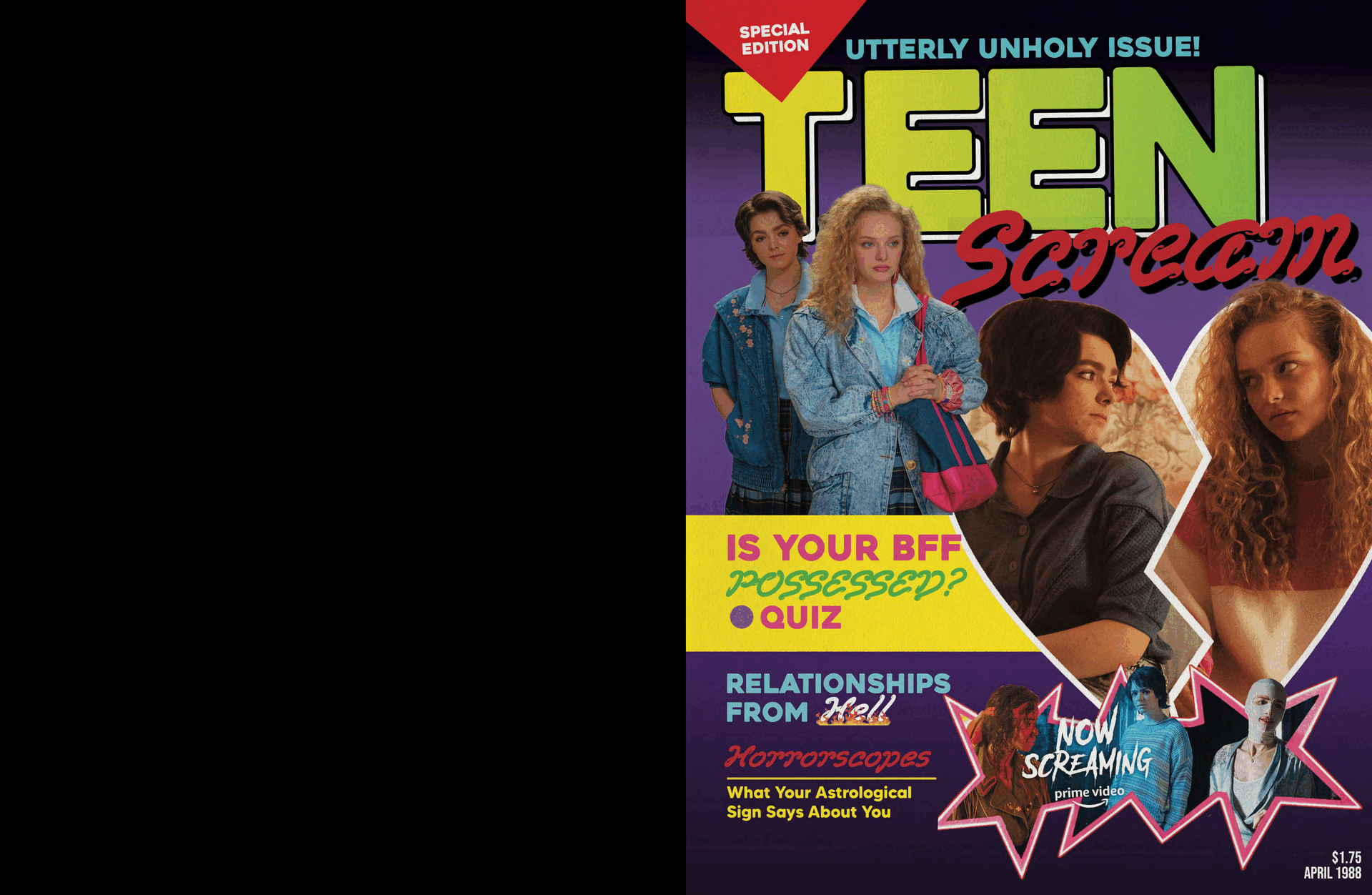 graphic design elements from various iterations of prime video’s spooky seasonal event – now screaming. for their 2022 event, which screened my best friend’s exorcism, i designed branded concessions containers printed on sourced blanks, photo collages for photo experiences, and i also created a 14-page magazine inspired by 80s teen rags. the following year, prime video promoted totally killer as their featured film. for this one, i devised the branding for the event as well as their wider promotional campaign, inclusive of a logo, colour scheme, and custom background used in all event signage and printed materials. (i also designed and styled in-world outfits for all public facing production assistants and brand ambassadors for the evening, as seen in the styling section.)