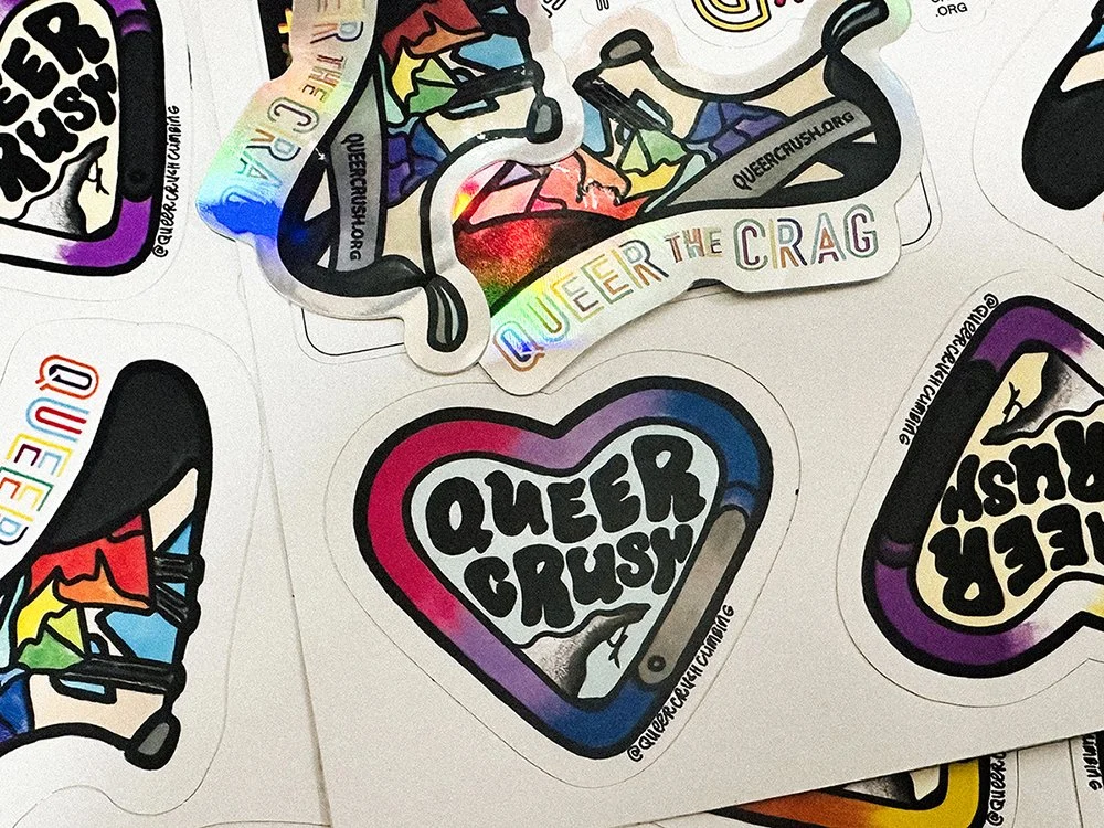 a collection of stickers i designed for queer crush’s in-person fundraising efforts at community events. i borrowed from both the climbing and queer communities, making use of both climbing iconography, and the colors + symbols of queer identities. i created these using initial sketches i drew digitally on procreate, and then refined in adobe illustrator.