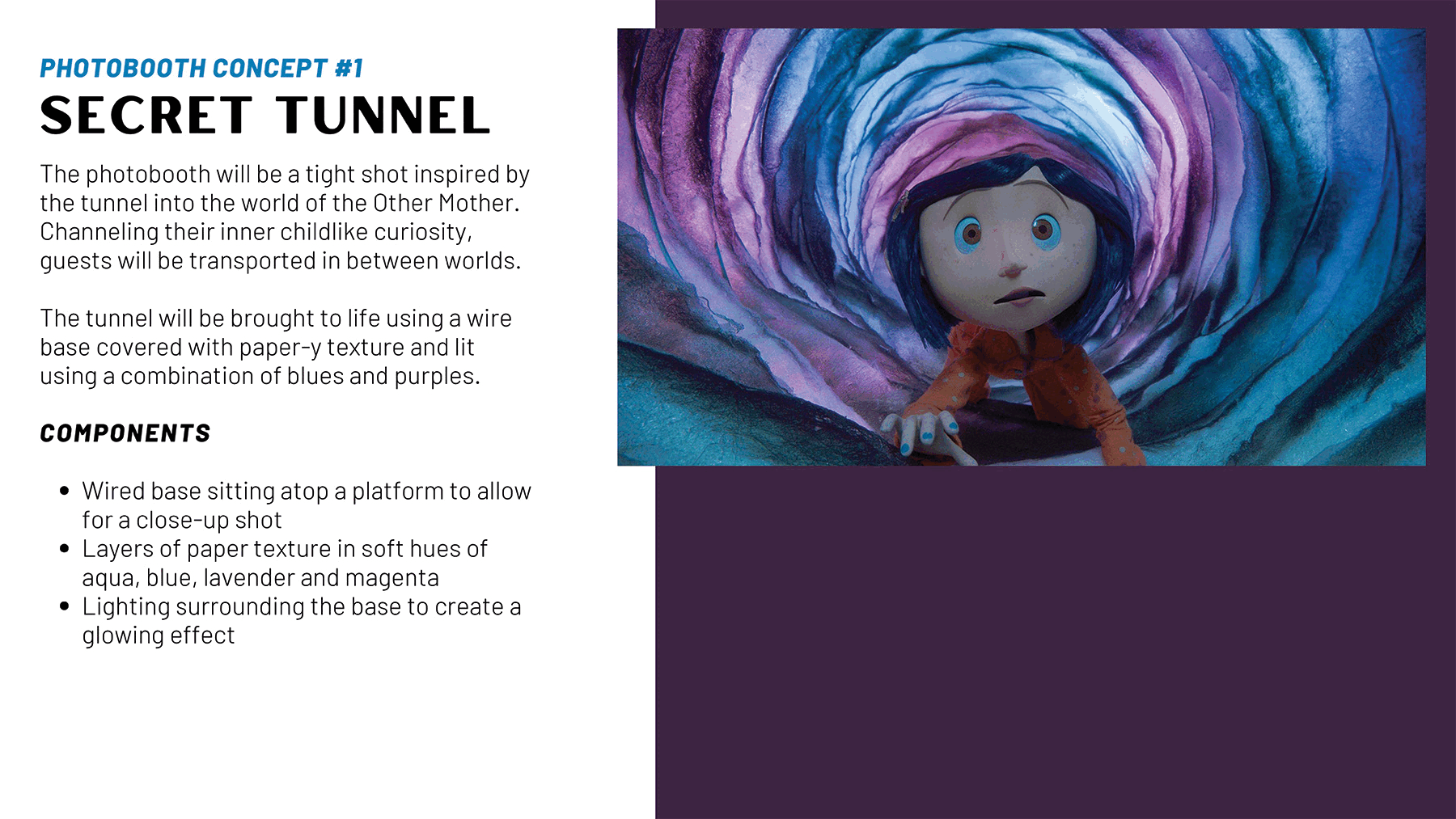 creative concept by me. for the 15th anniversary screening of coraline, cinespia collaborated with laika studios. for the photobooth, i presented the laika team with three different creative concepts and they opted for the simple, yet classic option of a close-up of the tunnel to the other mother and her dreamland. i also designed custom, themed cupcakes for an extra celebratory feel.