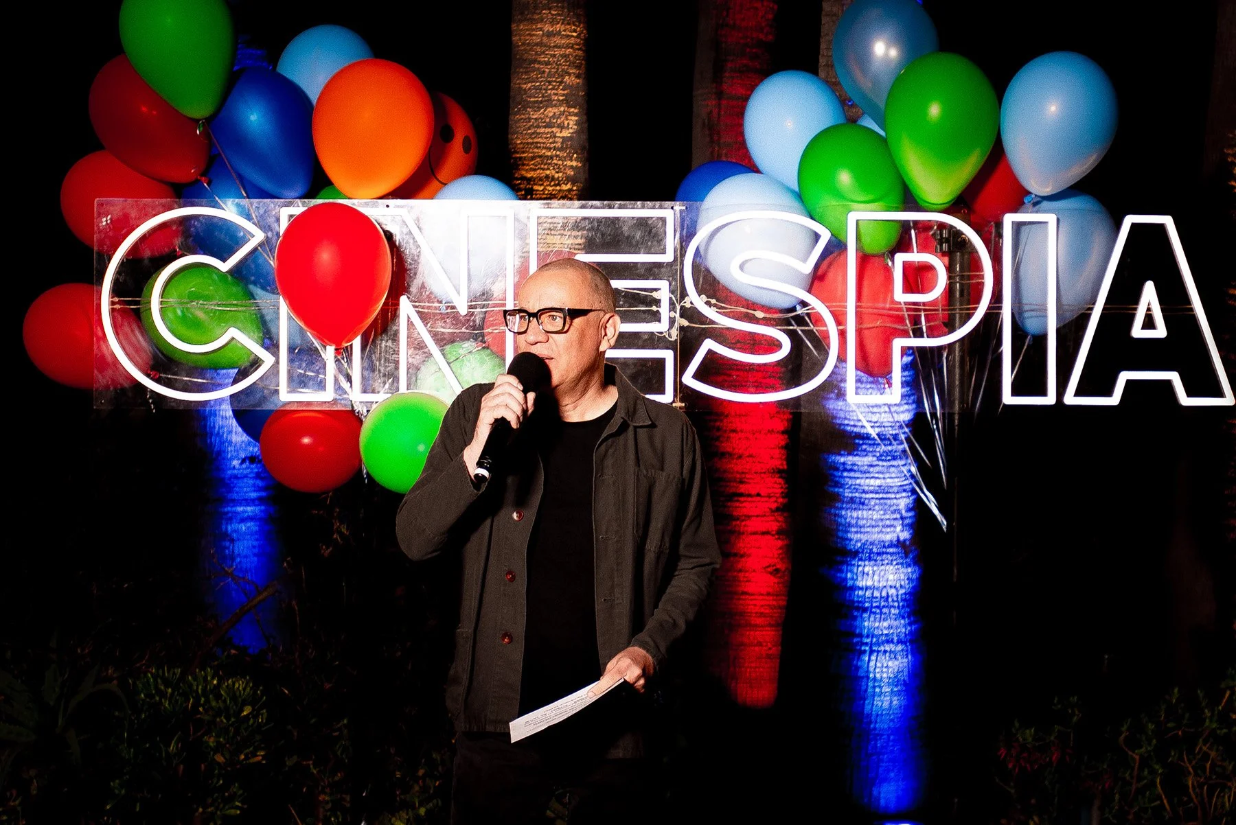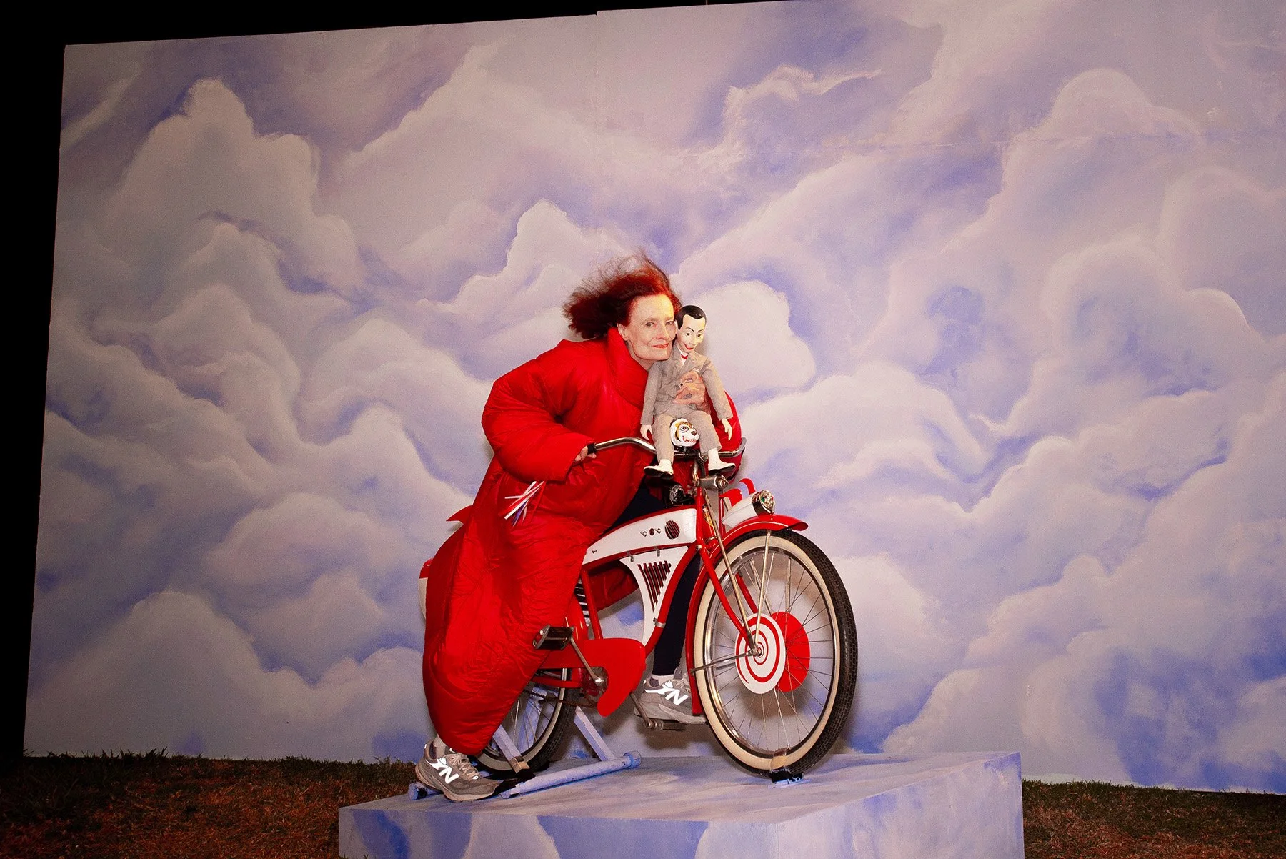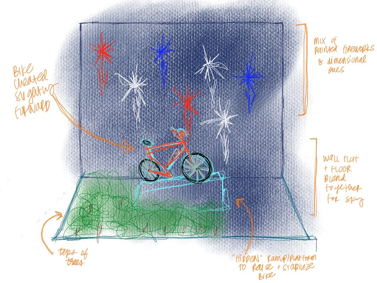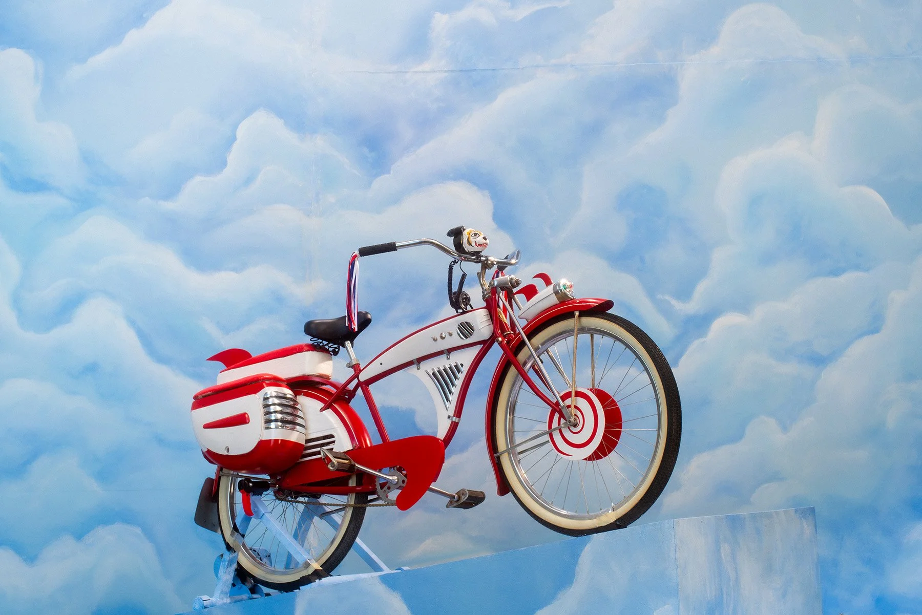 creative production and concept design by me. graphic design by me. i originally conceptualized this design for a 4th of july screening event for pee-wee’s big adventure in 2023; i wanted to create the illusion of flying through the air on pee-wee’s bike in a larger-than-life adventure. we sourced a bike secondhand and added the lion siren, front wheel swirl, and rear toolbox. to really give the effect of soaring, the bike was angled on a ramp painted to match the backdrop – painted with bright fireworks illuminating the 4th of july skies. this experience became the most successful photobooth ever, so of course i had to bring the idea back for our paul reubens tribute screening. this time, i opted for a dreamy blue sky as an homage to the iconic photo. i also designed a secondary photo moment, custom cupcakes, and a collage-style postcard with hand drawn details as additional mementos.