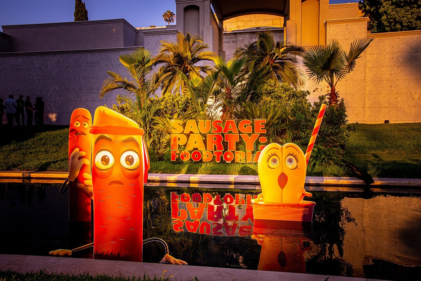 creative concept and design by me. for prime video’s premiere event for sausage party: foodtopia, i designed three options for a photobooth studio experience: a glam, red carpet moment to pose with the stars of the show, a trippy, kaleidescopic moment of layered character cut-outs inspired by the psychedelic scenes in the show, and a duck and cover mission set mirroring the show’s promotional imagery. the third option was ultimately achieved through larger than life cut-outs and equally enormous cutlery to fend off any enemies. i also designed a secondary photo moment, making use of hollywood forever cemetery’s reflecting pond. to fully set the scene, i collaborated with our production and lighting teams and sourced shrubbery, employed fiery orange uplights and plenty of low fog, and created character and title treatment cut-outs to top it all off.