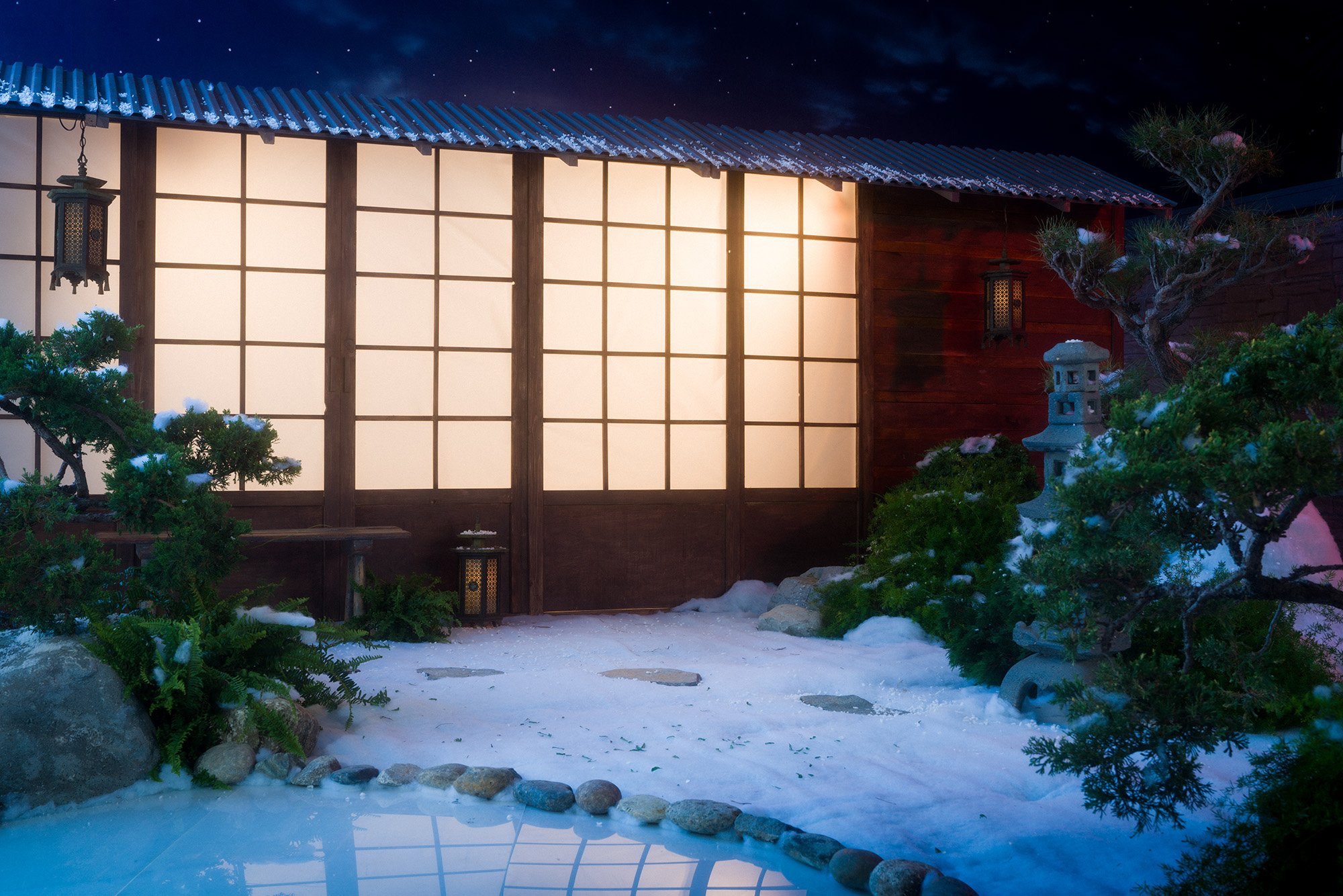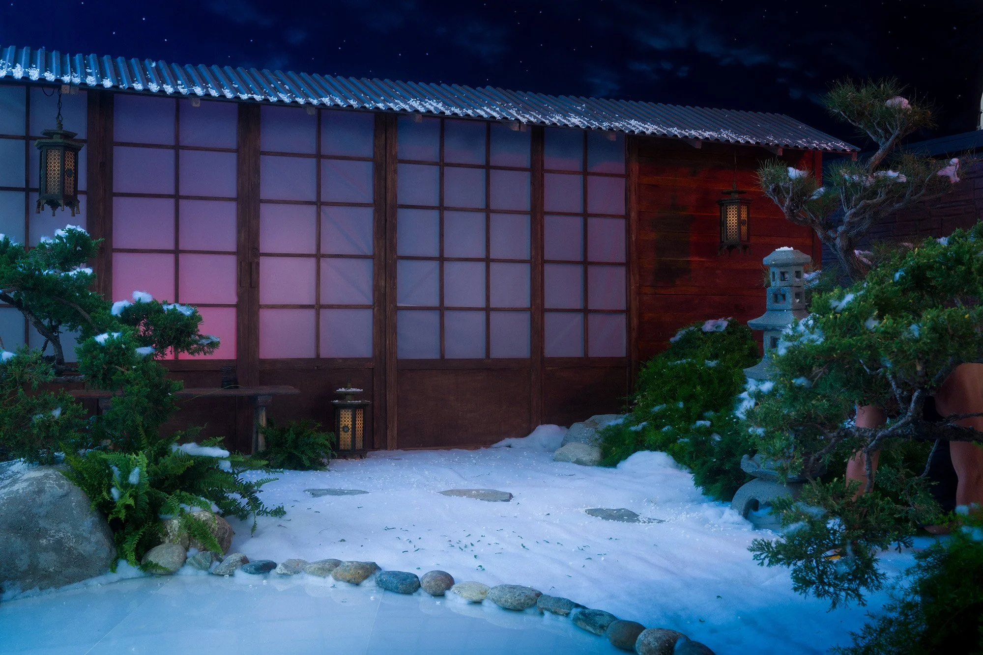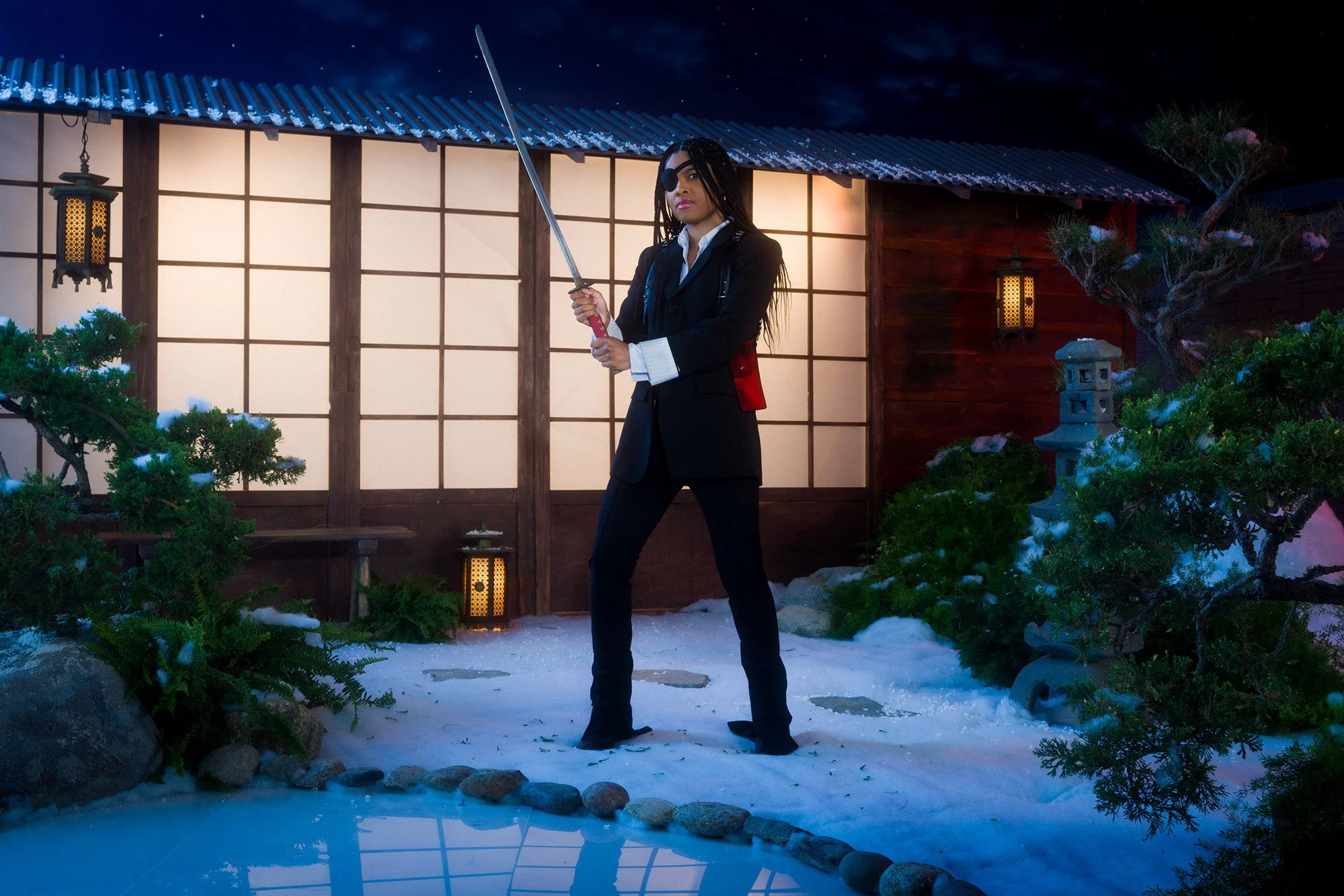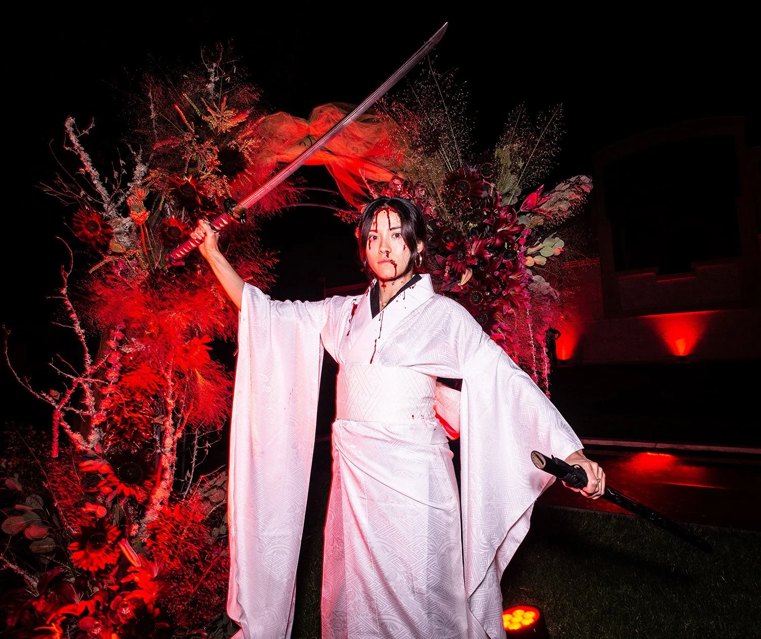 costumes + hmu sourced and styled by me. inspired by the femme fatales of kill bill 1 + 2. gwen’s kimono is a white silk nagajuban and obi from little tokyo, naomi’s look is a combination of tailored suit pieces plus my personal bond hardware harness, and nicolette is in vintage adidas, featuring hand painted trainers. photobooth concepts and bride cutouts by me. the perfect set for a killer duel, and an even killer memento. taking inspiration from the fight finale between o-ren and the bride, i concepted a snowy, nighttime garden scene. working with our production team, i sourced the perfect starry blue sky backdrop to pair with a screen façade modelled after japanese residential architecture, a stone-paved path on snow trodden ground, pond using reflective plexiglass and evergreen shrubbery. as a secondary photo moment, i concepted a stained glass church altar for any impromptu i do’s. and for the finishing touch, i created cutouts of the bride’s two personas.